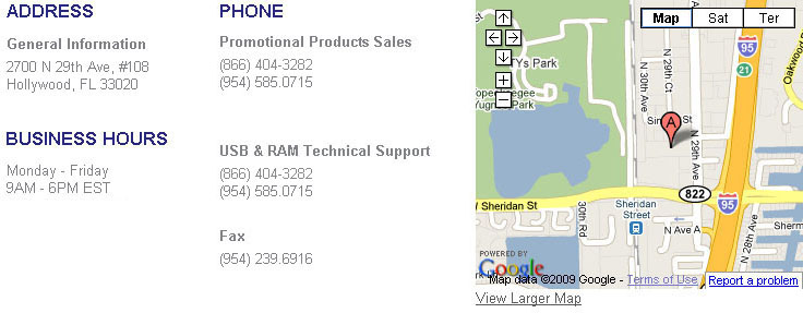 We want to make it easy as possible for you to order custom flash drives from us, so contact us by whichever means is best for you. Our phone, address, map, fax information for USB promotional products and RAM sales or support are located above. Our daily business hours are the normal business hours, eastern standard time. If you would prefer to contact us digitally, our USB flash drives quote form and other email address information for general, sales, technical, and employment information are located below. We look forward to working with you in the future so that we can assist in building you the ultimate promotional USB and custom flash drive products!